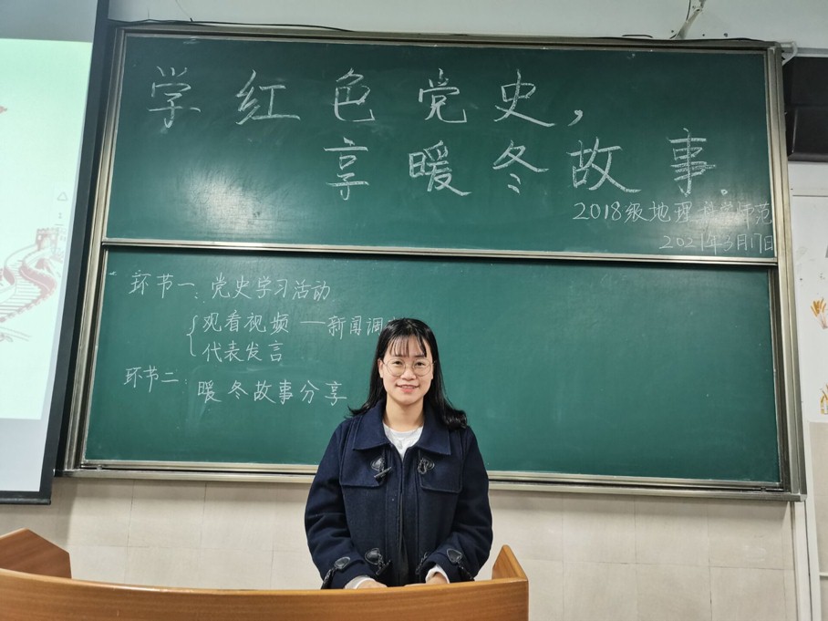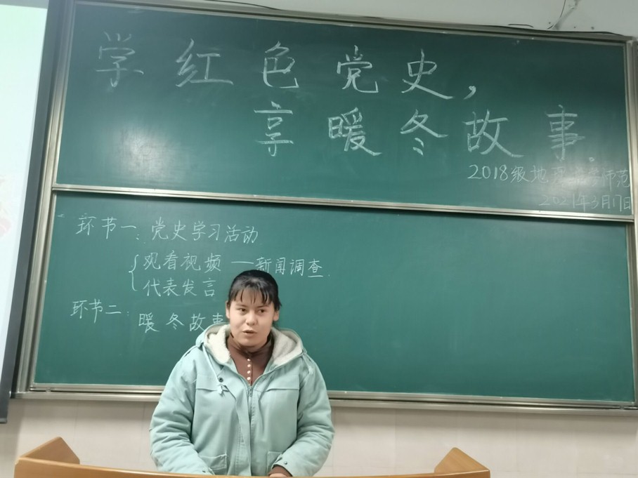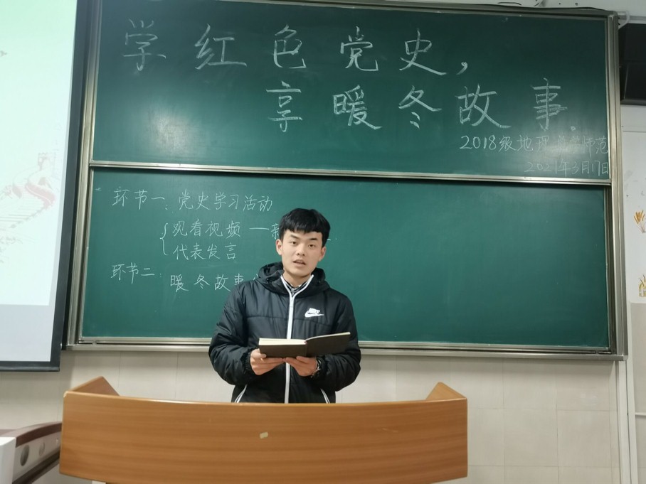本网讯(地旅学院 何雨婷 丁茹栩)为庆祝建党100周年,让红色基因的种子在校园生根发芽、代代相传,3月17日下午7点在4号教学楼举行2018级地理科学(师范)“学党史”主题班会。此次班会由团支书何雨婷主持,2018级地理科学(师范)专业全体成员参加。